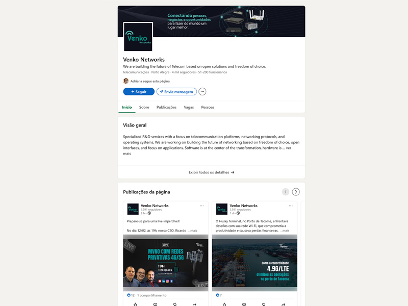 We create and manage all social media for Venko Networks, a global connectivity company with verticals in services, research and development and products, present in more than 10 countries. With its B2B focus, serving operators and internet providers, Venko delivers daily content on its channels through Conquista, with articles, news, adverts and videos, balancing the commercial and the informative for a loyal audience of thousands of followers. We also create and operate your lives, broadcasting them on multiple channels.
