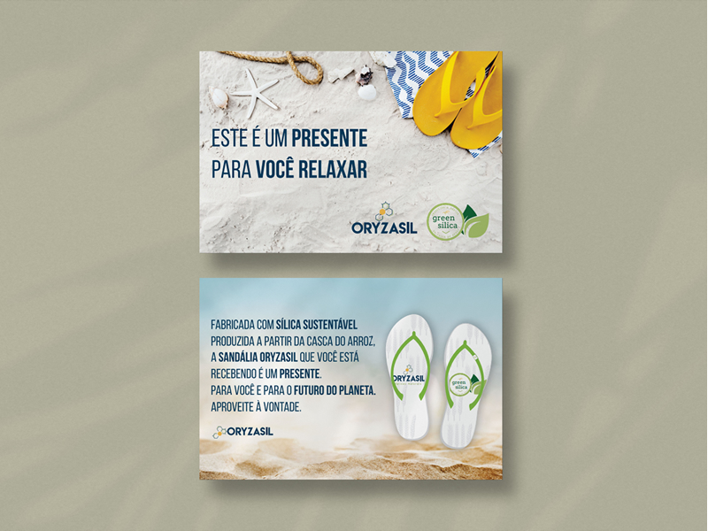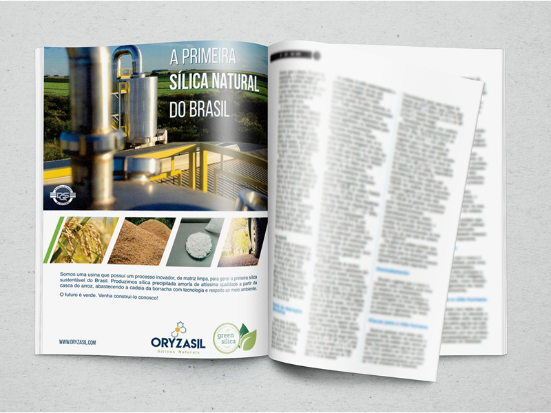 Criamos diversos materiais gráficos para a Oryzasil, como anúncios, apresentações, cartazes de endomarketing, newsletters, cards impressos e digitais, assim como o selo Green Silica.