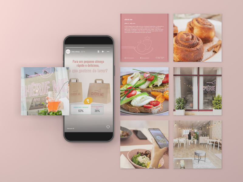Criação de Marca e Identidade Visual para o restaurante Chérie Me, de Espinho, Portugal. Com um posicionamento claro na "comfort food" saudável, o restaurante precisava de uma marca que transmitisse, com delicadeza, sua atividade e inspiração francesa. O resultado é uma marca diferenciada que permeou todos os materiais gráficos decorrentes. Entre eles, destacamos a sinalização externa e interna do ambiente, a personalização das mesas, cardápios, cartões de visita, canecas e layouts para as aplicações digitais e posts nas redes sociais.