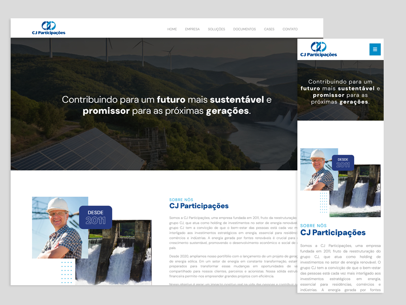 Desenvolvemos a plataforma digital da CJ Participações, holding de investimentos no setor de energia renovável, que atua com hidroelétricas e fazendas solares. O site apresenta as empresas que compõem o grupo, as diversas soluções inovadoras e sustentáveis que oferece na área energética, com design responsivo e um painel administrativo intuitivo para gestão dos documentos disponíveis para download.