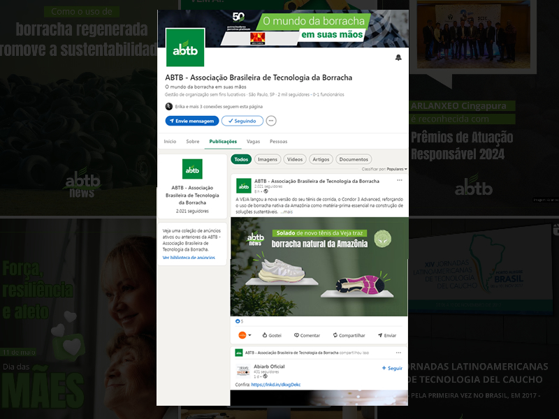 We are responsible for the creation and management of all social media channels for the Brazilian Rubber Technology Association (ABTB), the primary organisation representing companies in the rubber technology sector and associated activities, with a 50-year history. We produce textual, graphic and audiovisual content, feed the News section of the association's website and interact with the followers of the profiles.