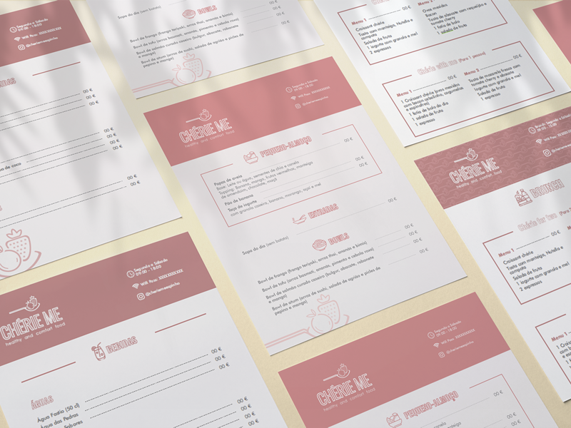 Branding and visual identity creation for the Chérie Me restaurant, located in Espinho, Portugal. With a clear positioning in healthy ‘comfort food’, the restaurant needed a brand that would delicately convey its activity and the French inspiration that defines the concept of the space. The result is a distinctive brand that permeated all the resulting graphic materials. Among them, we would highlight the internal and external signage, the personalisation of tables, menus, business cards, mugs and layouts for digital applications and social media.