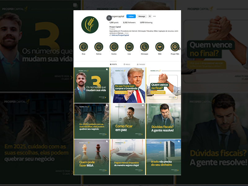 We create and manage all the social networks for Prosper Capital, a national leader in business consultancy, operating in more than 20 states in Brazil. Covering a spectrum of clients in the ISP, technology and services segments, Prosper relied on Conquista to create its brand, visual identity, corporate voice and all the content for its networks, including videos, news, articles and commercials. Also working in paid traffic management, we deliver qualified leads through a combination of Social Ads, Google Ads and inbound marketing strategy, involving landing pages, campaigns, lives, etc.