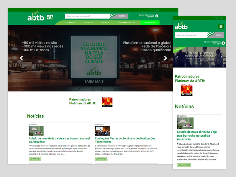 With 50 years of history, the Brazilian Rubber Technology Association is the primary organisation representing companies in the rubber technology sector and related activities. In addition to institutional information, an events calendar and news, the robust portal developed for ABTB offers its own content manager and a restricted area for members, providing access to a platform with a technical collection of more than 1,000 files.