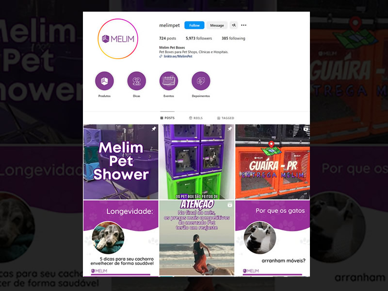 We create and manage all the social networks for Melim Pet Boxes, a manufacturer of innovative products for Pet Shops, Veterinary Clinics and Aesthetics, a company for which we also created the brand and visual identity. Its thousands of loyal followers receive daily content, produced with videos, banners, animations, cases, warnings, tips, articles and news. It's a perfect blend for pet entrepreneurs, attracting clients from all over Brazil.